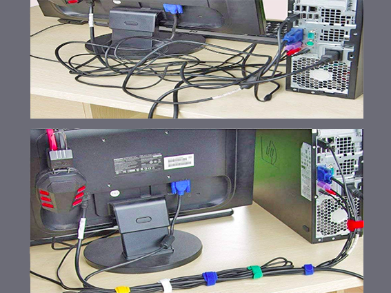 デスク下やパソコン背面など見えにくい場所の配線整理にも最適。電源コードやケーブルのごちゃつきを防ぎ、ホコリがたまりにくく、掃除もしやすくなります。快適な作業環境づくりに役立つ整理アイテムです。